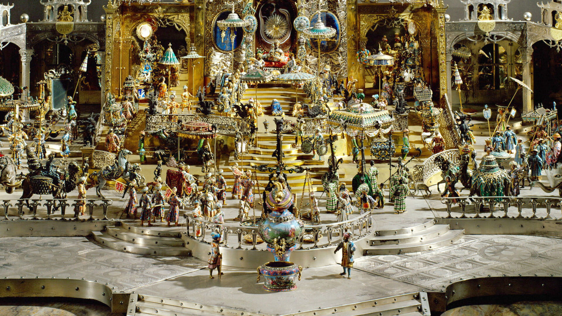 Ale nie tylko je. Król kazał tam pokazać tak niezwykłe wyroby jubilerskiego kunsztu, jak dzieło z warsztatu braci Dinglingerów "Dwór w Delhi w dniu urodzin Wielkiego Moguła Aurenga Zeba". Na tę indyjską scenę dworską składa się 137 kolorowych emaliowanych figurek ze złota. Do tego dochodzi około 3 tysięcy diamentów, rubinów, szmaragdów i pereł. Wartość "Dworu...", w momencie powstania w latach 1701–1708, dwukrotnie przewyższała wartość pałacu myśliwskiego saskich elektorów w Moritzburgu, który liczy, bagatela, 200 pokoi!